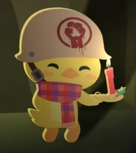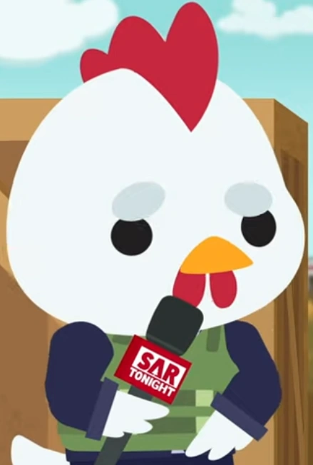 A Super Chick who works for and is a member of the SASR (Super Animal Super Rebellion). Peep's debut appearance was during Joe Cluck's imprisonment in Super Animal Royale Tonight Season 2, Episode 2. Peep is portrayed as a kind, and caring super animal, who comforts and gleefully sings along with Joe Cluck when they were imprisoned and held hostage by Rebel forces in SART Season 2, Episode 2. She's also easily amused as Peep can be seen grooving along to the S.A.W Shop ad in Super Animal Royale Tonight Season 2, Episode 3, and laughing at zany Cackling Carl in one of their ads. Peep and Joe Cluck have become fast friends, and it seems like Peep is helping Joe Cluck during their imprisonment by Rebel forces as much as they can. Peep does not appear as an NPC in game, and is strictly a character in Super Animal Royale Tonight.