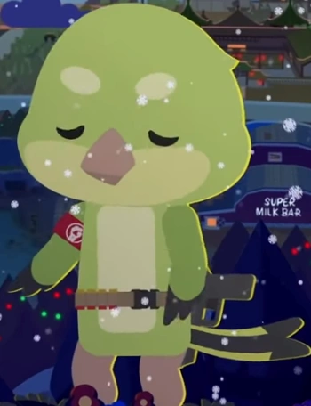A Super Lark singer/artist who sings at the Beakeasy near Giant Eagle Landing. When players arrive at the Beakeasy, they have a chance of hearing either Blue Jay Z, Lady Caw Caw or Kelly Larkson sing a little of one of their songs! Kelly Larkson does not appear in game as a NPC, however players are able to acquire all of their cosmetics via the rotating Cackling Carl's Cart. Kelly Larkson is also one of the few super animals to have a star on the Walk of Stars walkway by the Shooting Gallery, and the Super Animal Royale Tonight studios buildings!